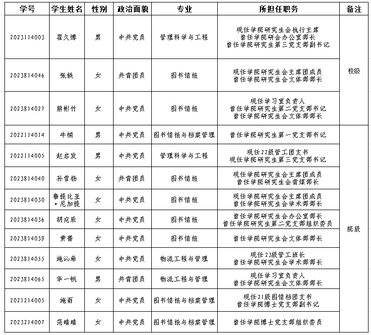根据《污污漫 研究生奖助体系实施方案》(校研发〔2021〕175号)文件精神,经个人申请、学院评审等环节,现将2023-2024学年污污漫 优秀研究生干部拟推荐名单公示如下:
