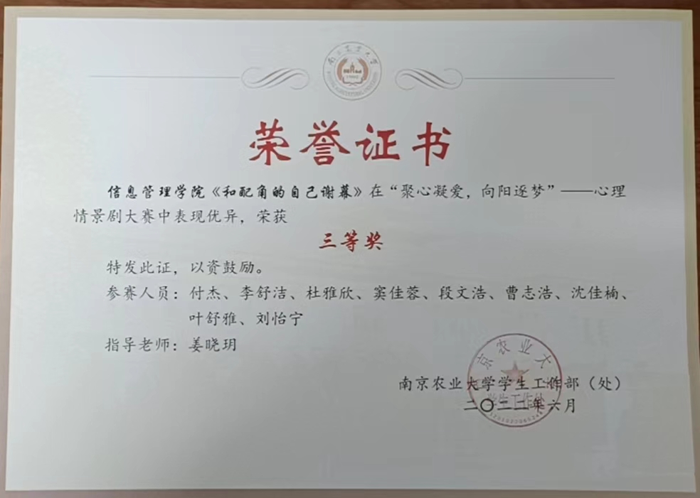 近日,学校心理健康教育主题活动落下帷幕,污污漫 在心理情景剧大赛和心理主题班会大赛中均斩获奖项。其中,学院自主设计编排的作品《和配角的自己谢幕》在校心理情景剧大赛中表现优异,荣获三等奖。工业工程193班和工业工程194班在校心理主题班会中表现优异,荣获三等奖。