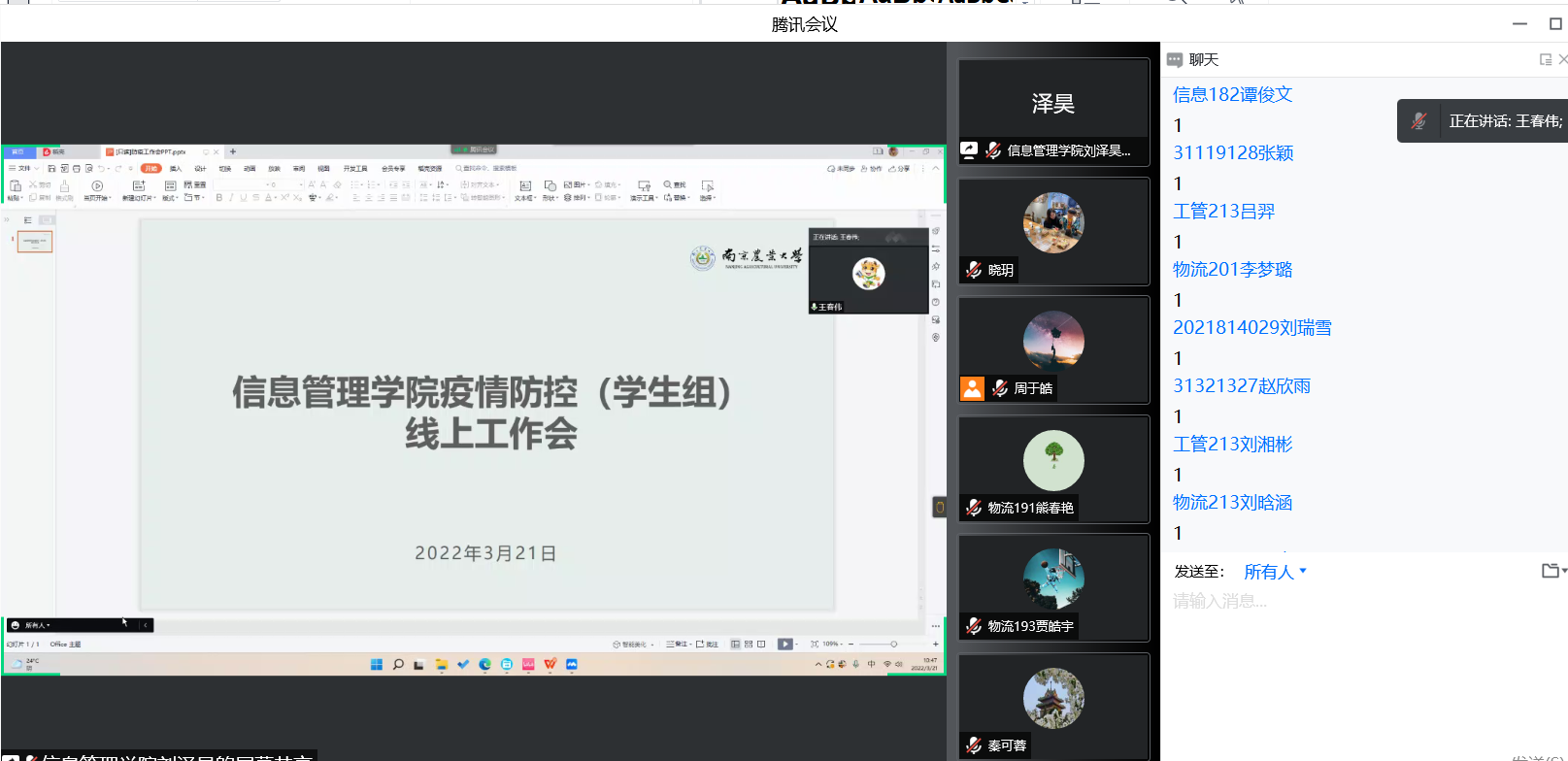 3月21日,学院召开疫情防控(学生组)线上工作会议。学院党委副书记王春伟、学工办主任(团委书记)姜晓玥、学工办副主任(团委副书记)夏丽君、专兼职辅导员、班级联络员、部分党员和学生干部共60余人参会。