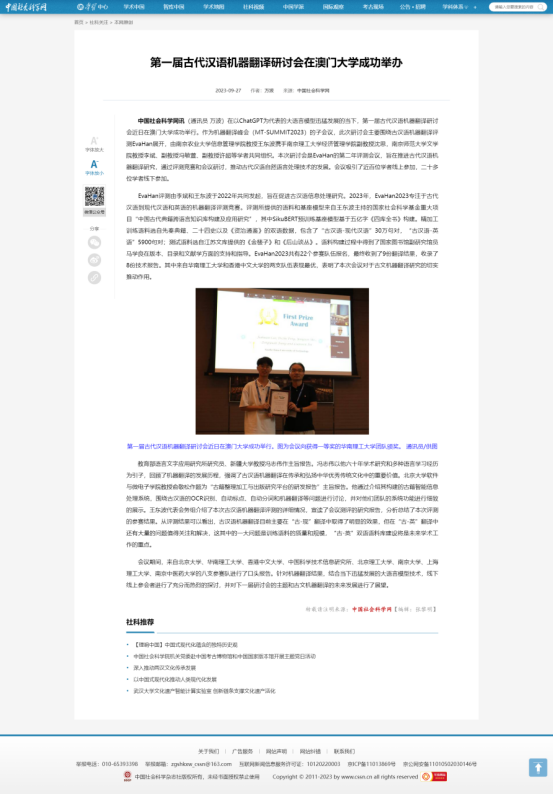 9月27日,【中国社会科学网】报道污污漫 王东波教授团队主导组织的全球第一届古代语言机器翻译研讨会成功举办。