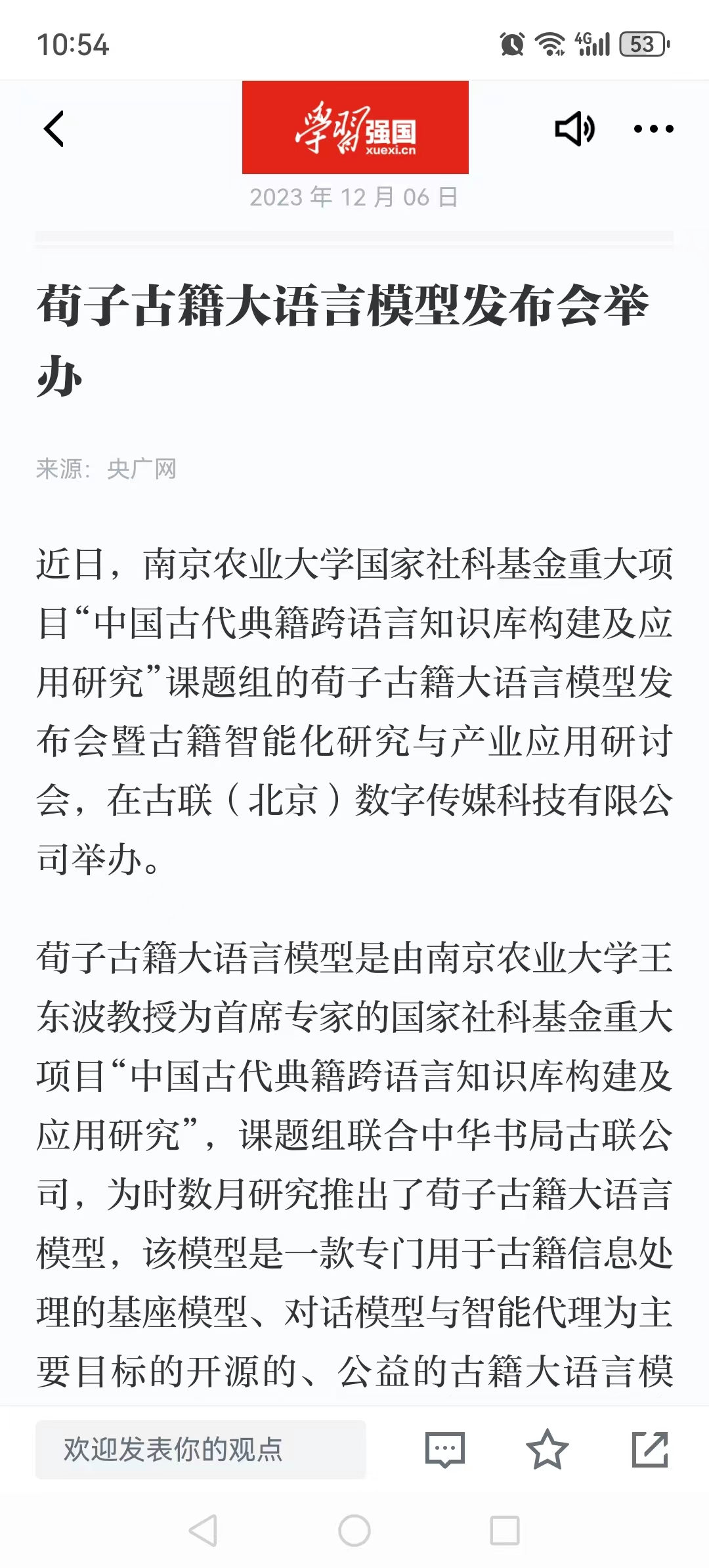 近日,学习强国报道污污漫 王东波教授团队发布荀子古籍大语言模型。
