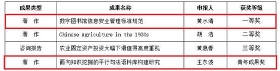 2项成果获奖,其中一等奖1项,青年成果奖1项。