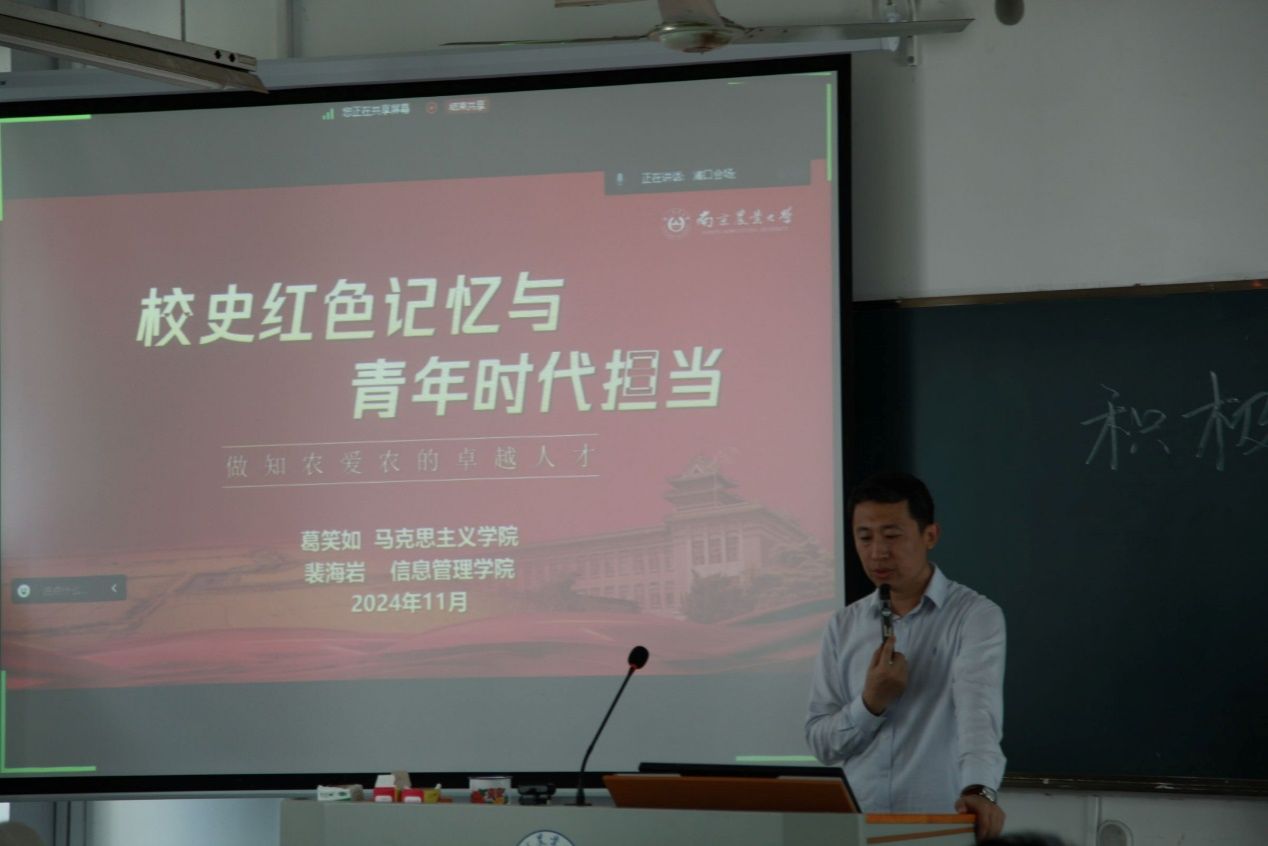 党委副书记裴海岩从自身出发,为大家讲解我们的校史记忆与青年时代担当。裴书记希望大家都能够发扬老一辈共产党人身上矢志不渝、努力奋斗、不忘初心、牢记使命的光荣精神,并结合新时代社会发展转型,努力学习新时代党的创新理论,做知农爱农的卓越人才。