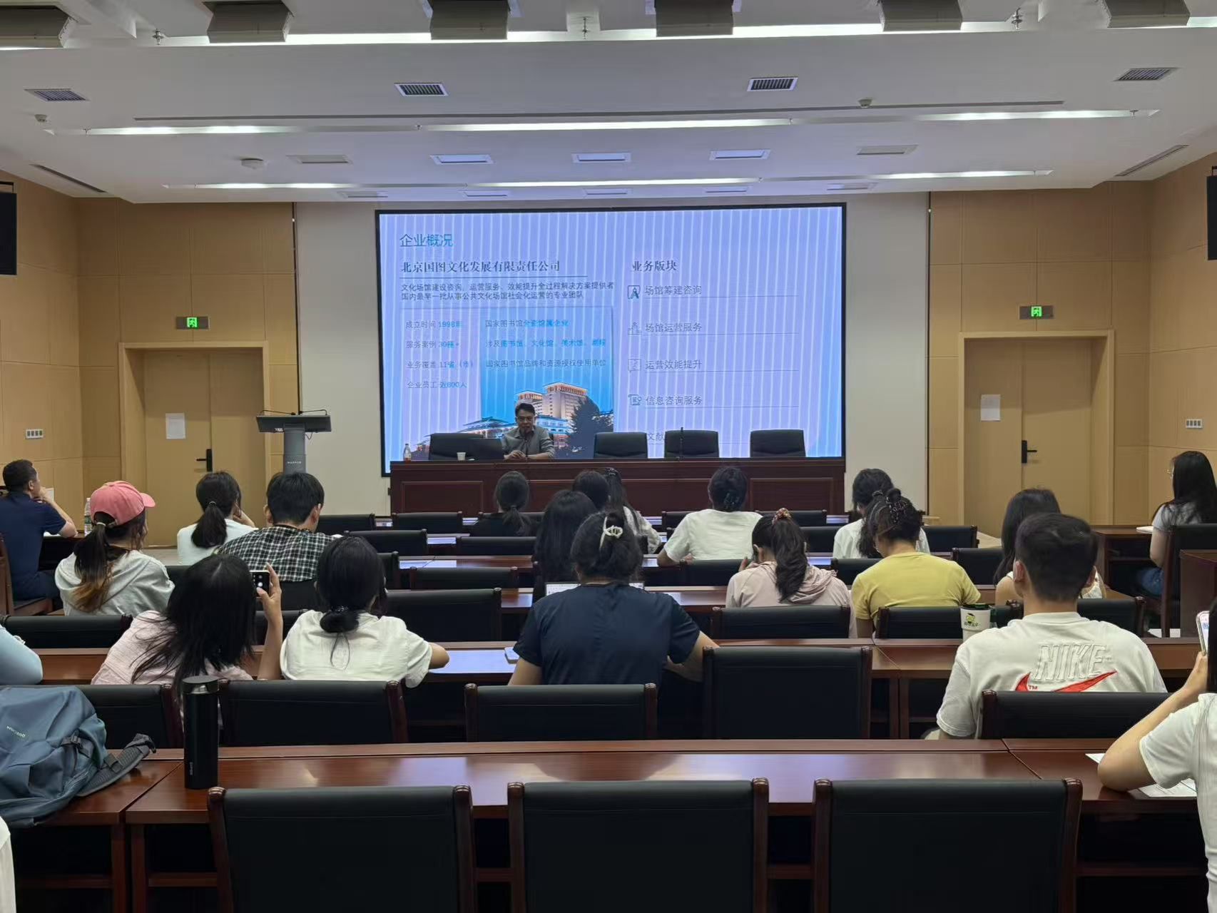 史双建介绍了社会力量参与公共文化服务的政策演进与实践模式,具体介绍了管理决策型、政府购买型、PPP型、自建共享型等7种国内实践模式的差异,并分享了具体知名案例,他重点介绍了南京江北图书馆社会化运营的创新实践,南京江北图书馆作为全国首家“国家图书馆共建馆”,以“高品质文化活动、产业信息服务”为核心,既服务生活、又服务生产。同时,史双建向同学们介绍了北京国图文化发展有限责任公司的基本情况、发展历程、服务案例、岗位设置、招聘条件等内容,他围绕职业生涯发展和个人职场发展,详细分析了大学生在校期间需要培养哪些专业能力和综合素养,强调了职业规划对个人发展的重要性。