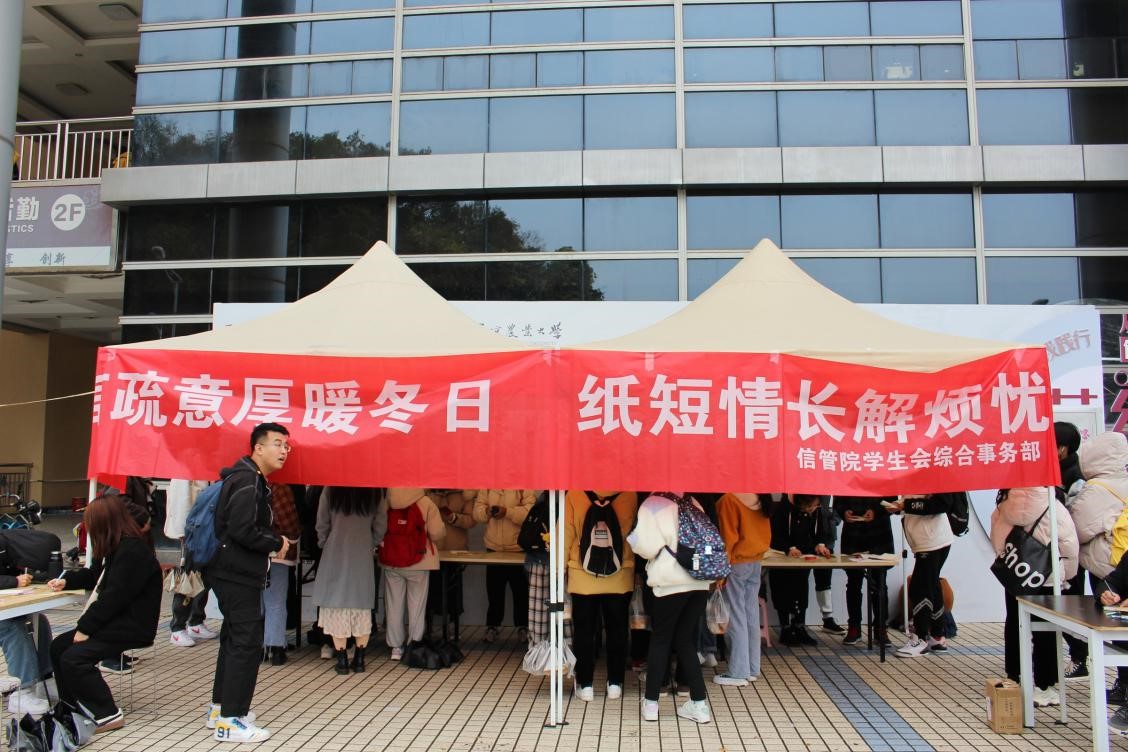 活动中,综合事务部工作人员分工明确,积极热情的为参与活动的同学介绍活动内容,并帮助他们参加活动。参与者按照指引,有序的报名,领取自己喜欢的信封。在领取信封后,同学们可在规定时间内写下自己的烦恼忧愁交于信管院学生会办公室处,同时领取他人的信封进行解答。在为期三天的时间里,同学们可对他人的问题进行解答。解答完成后,综合事务部工作人员组织参加生活类的同学们交换取回自己的信封,并以QQ官方号的形式发表优秀学长学姐们对有代表性的学习类问题的解答,至此活动圆满结束。