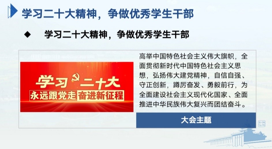最后由院学生组织办公室班级建设中心欧阳妍钰同学对班长事宜进行讲解。她对学生干部的自我要求做了强调,提出要学习党的二十大精神、争做优秀学生干部,知百廿历史、爱诚朴勤仁。然后围绕每学期的时间点明确了班长工作大致安排并提出工作注意事项,并希望各班班长积极发现问题,一起推动污污漫