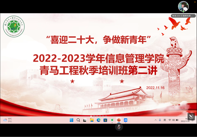 新生学生干部工作能力与基本技能,信管院学生组织办公室在11月16日开展的青马工程第二期在线上顺利举行。本次活动邀请了学生会主席陈佳烨和青媒主席唐语舒,就基本技能培训与新媒体运营进行分享。