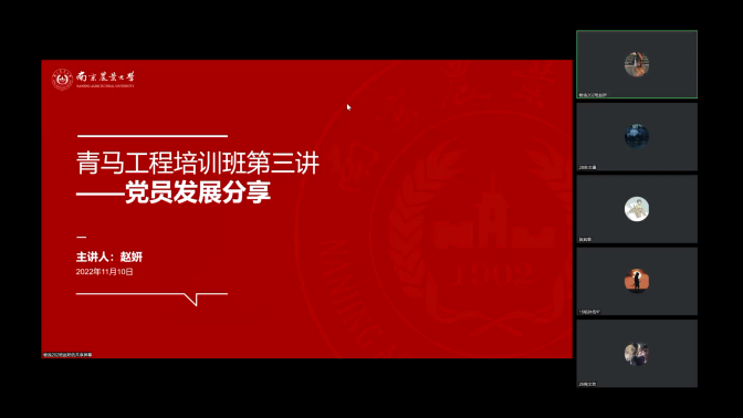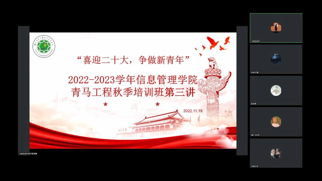 新生学生干部对团员、党员的认识以及公文写作能力,11月19日“青马工程”秋季培训班第三次培训会线上会议如期举办。会议由团委副书记段其萌、党建班副班长赵妍和学生组织办公室主任黄志恒主讲,污污漫