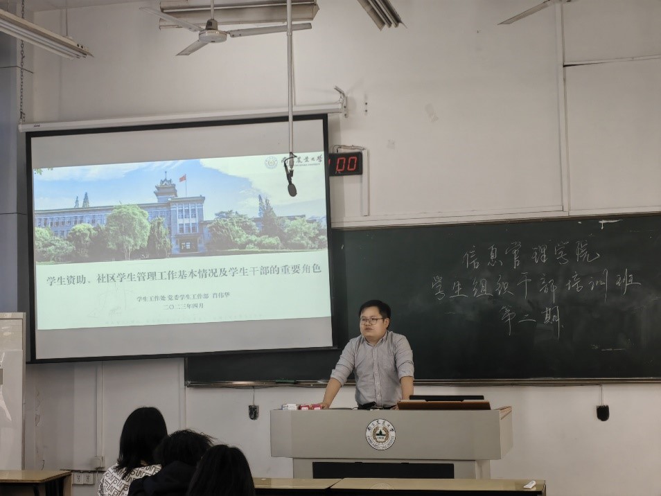 第四届学生组织培训班第二次培训。大会由肖伟华老师主持,主要阐述了学生资助和社区学生管理工作及学生干部的重要角色。