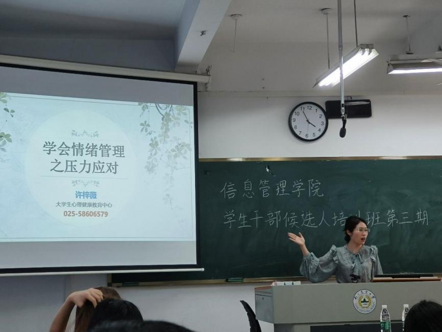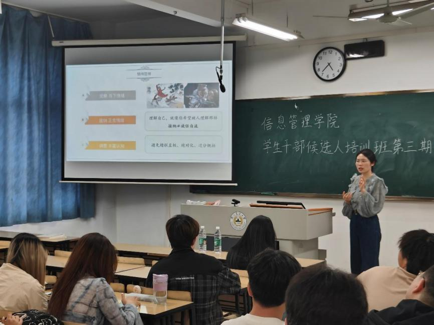 第五届学生干部候选人青马工程培训班之心理素质提升与情绪管理在汇贤楼A306教室举行。大学生心理健康教育中心专职教师许梓薇出席本次培训,污污漫