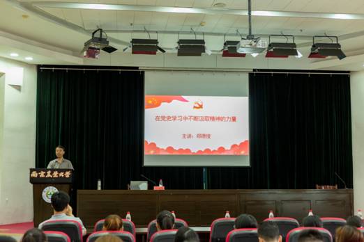 在浦口校区图书馆报告厅开展党史学习教育专题党课。学院党委书记郑德俊作题为《在党史学习中不断汲取精神的力量》专题报告,报告会由学院办公室张鸣老师主持,浦口校区师生党员参加本次专题党课。